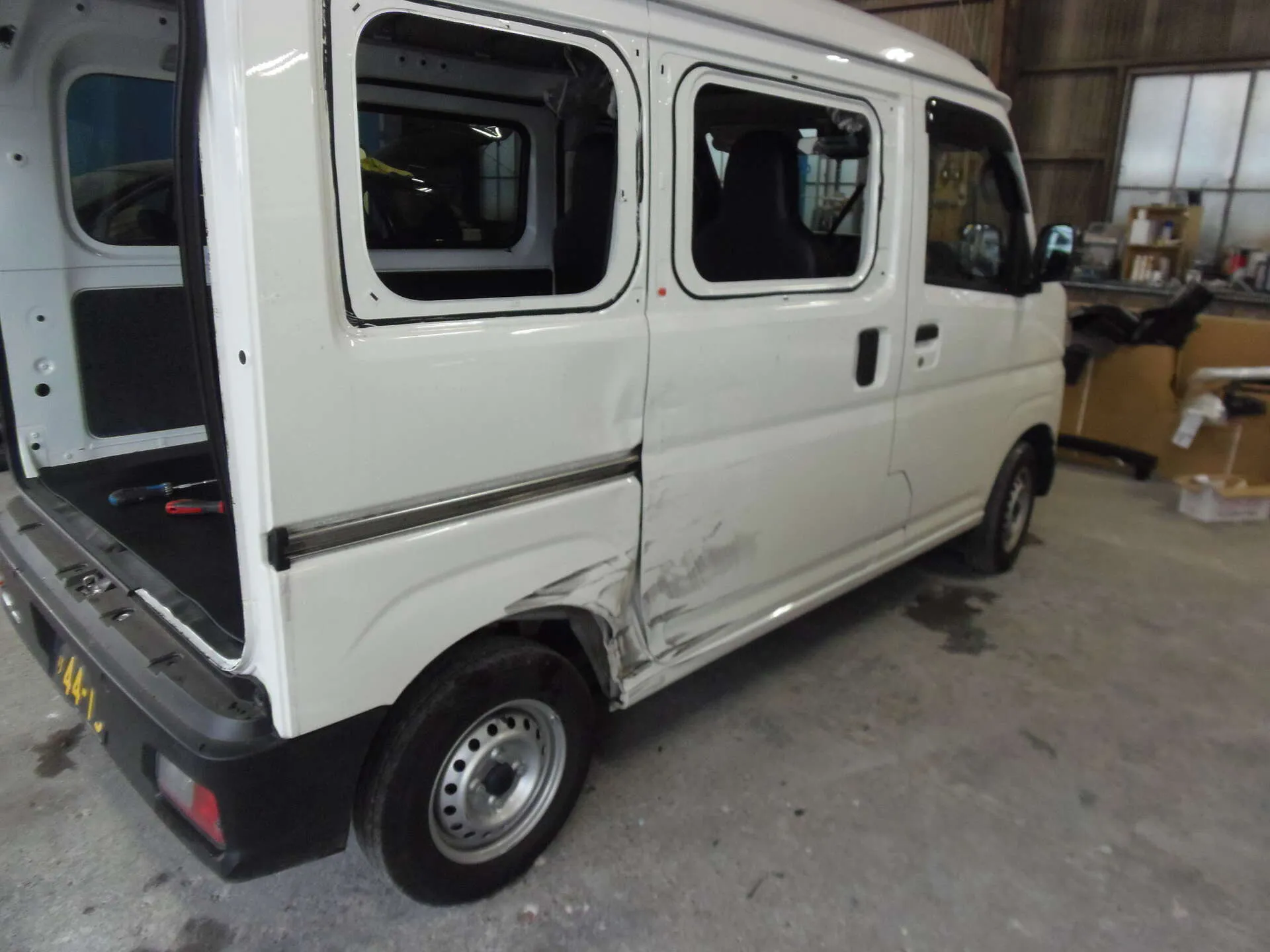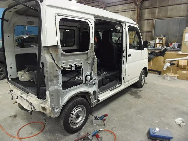 工場内で作業中の一台、白い軽バンが目に入ります。日常の配達やお仕事で