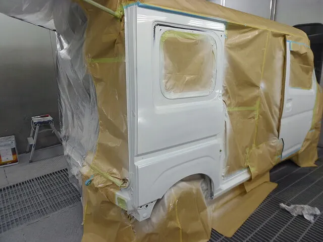 作業場で丁寧にマスキングされた車両が並ぶ様子から、